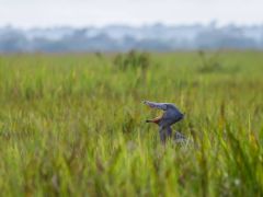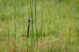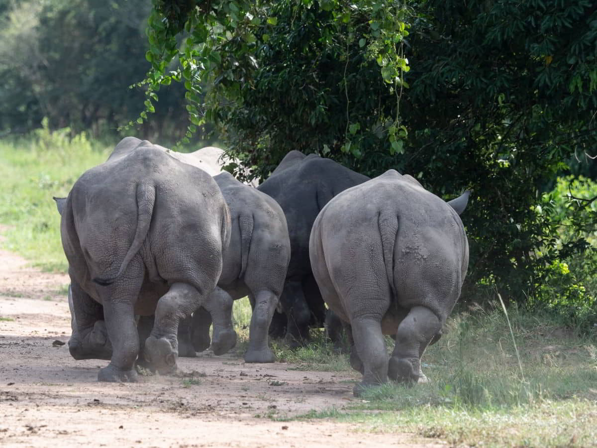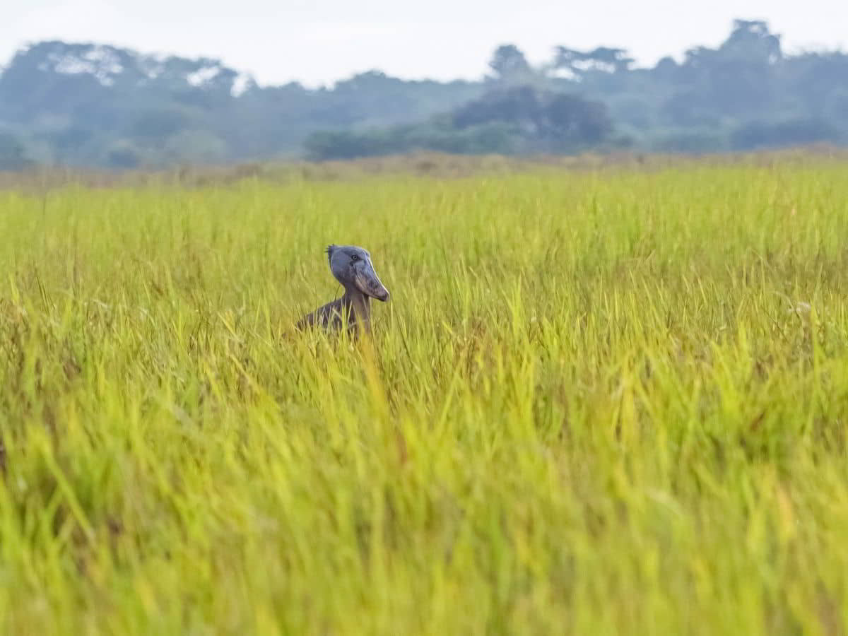 5 Uhr aufstehen und wir verstehen jetzt die dicken Barrieren: Direkt am Zaun des Campplatzes sowie auf dem Weg zum Büro liegen zwei Nashörner. 6 Uhr Abfahrt mit einem Führer zur Schuhschnabelsuche. Wir finden auch nach 1,5 Stunden Wanderung keinen, nur einen kleinen Vogel mit endlos langem Schwanz. Dann ein zweiter Versuch auf einem kleinem Boot durch Sumpfgebiet. Und siehe da, mitten im Schilf steht ein Schuhschnabel in ca. 250 Metern Entfernung. Olaf gelingt eine sensationelle Aufnahme.