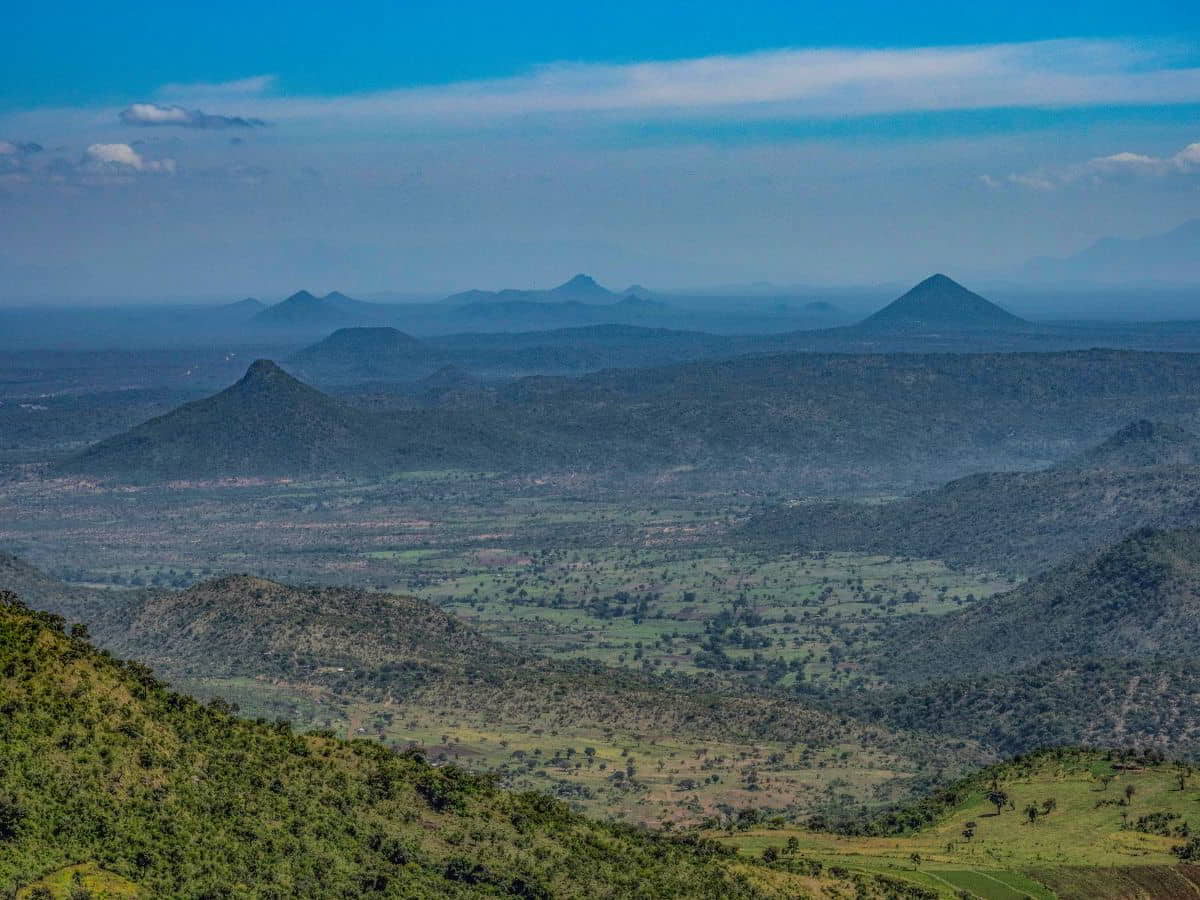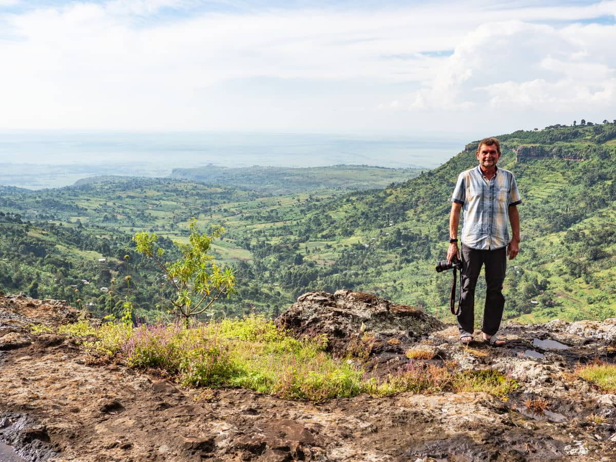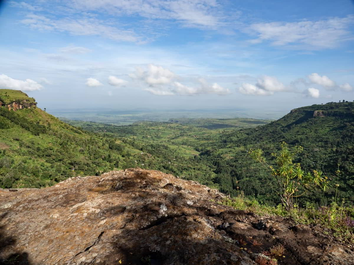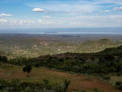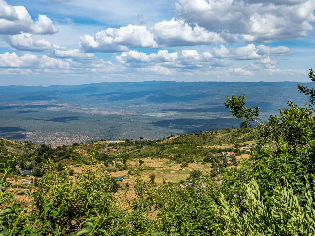 Dann kommt für Olaf ein harter Fahrtag. Von 3475 Metern die 30 Kilometer weit bis Kitale hinunter auf 1850 Meter in 1,5 Stunden. Dann über Eldoret bis Iten auf 2400 Metern Höhe. Tolle Aussicht auf einen Teil des Afrikanischen Grabenbruch, hier das Kerio Valley, dessen Sohle auf 1150 Metern liegt.