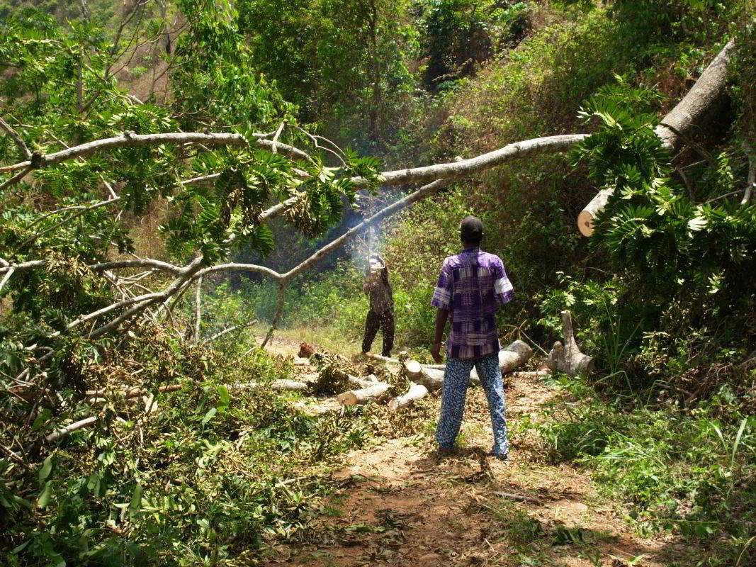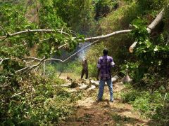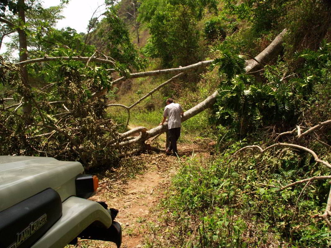 Über Bergpisten wollen wir nach Süden. Dann ein umgestürzter Baum quer über die Piste. Ein Mopedfahrer kommt, eine Säge ist irgendwo zu hören und wir versuchen ihm klarzumachen, daß wir so eine Säge bräuchten. Ok, no problem. Nach 1,5 Stunden warten, entschließen wir uns umzudrehen aber er kommt uns entgegen, der Mopedfahrer mit Sozius und langer Stiehlsäge. Ruck zuck ist das Hindernis beseitigt. Kaum zu glauben, auch das ist afrikanische Organisation.