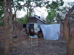 Wir treffen Alfred und fahren bei Nacht zu dessen Camp außerhalb des Parkgeländes.