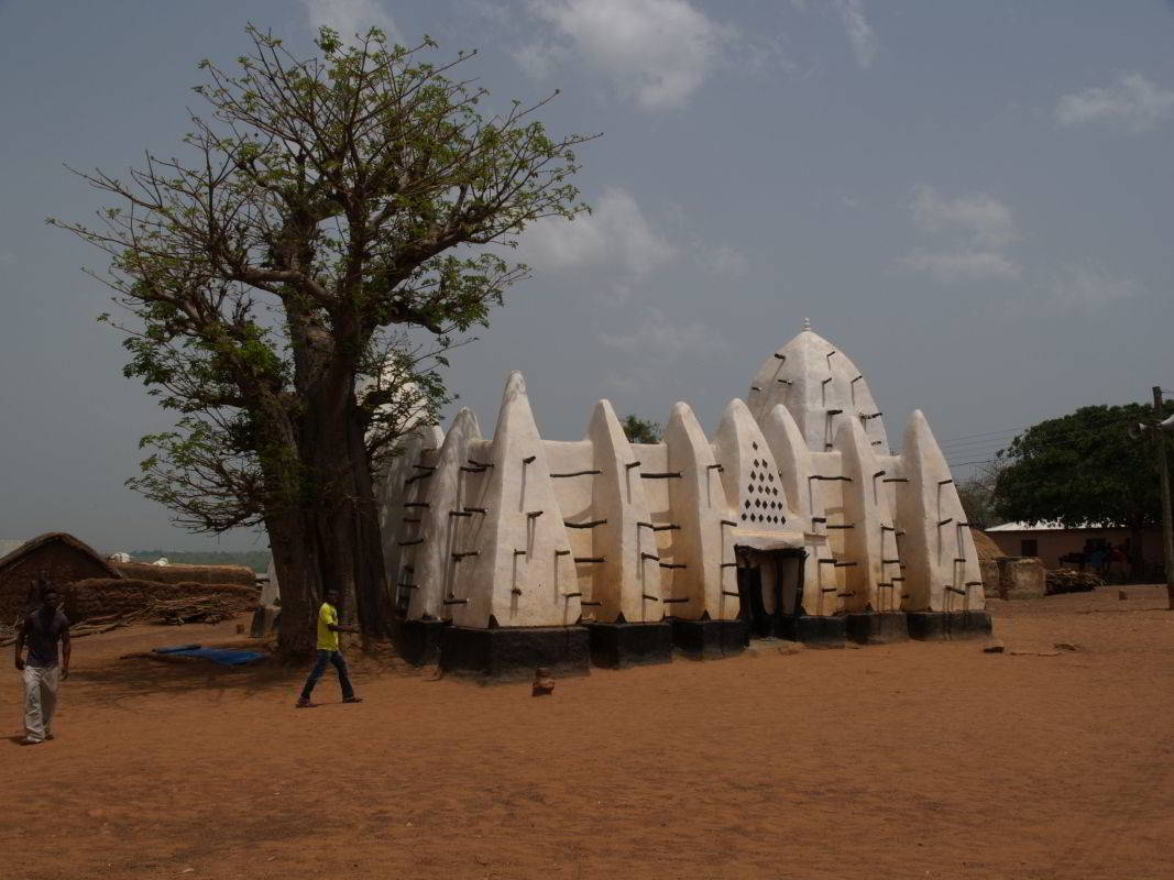 Die Hälfte unserer Reise ist bereits vorüber. Am nördlichen Ende des Volta Stausees biegt die 85km lange, üble Wellblechpiste zum Mole Park ab (in o.g. Karte als "Highway" bezeichnet). Weltkulturerbe "Moschee von Larabanga" na ja. Sofort Jugendliche die Geld kassieren, für das drumherumgehen. Mittags sind wir dann im Mole Park.