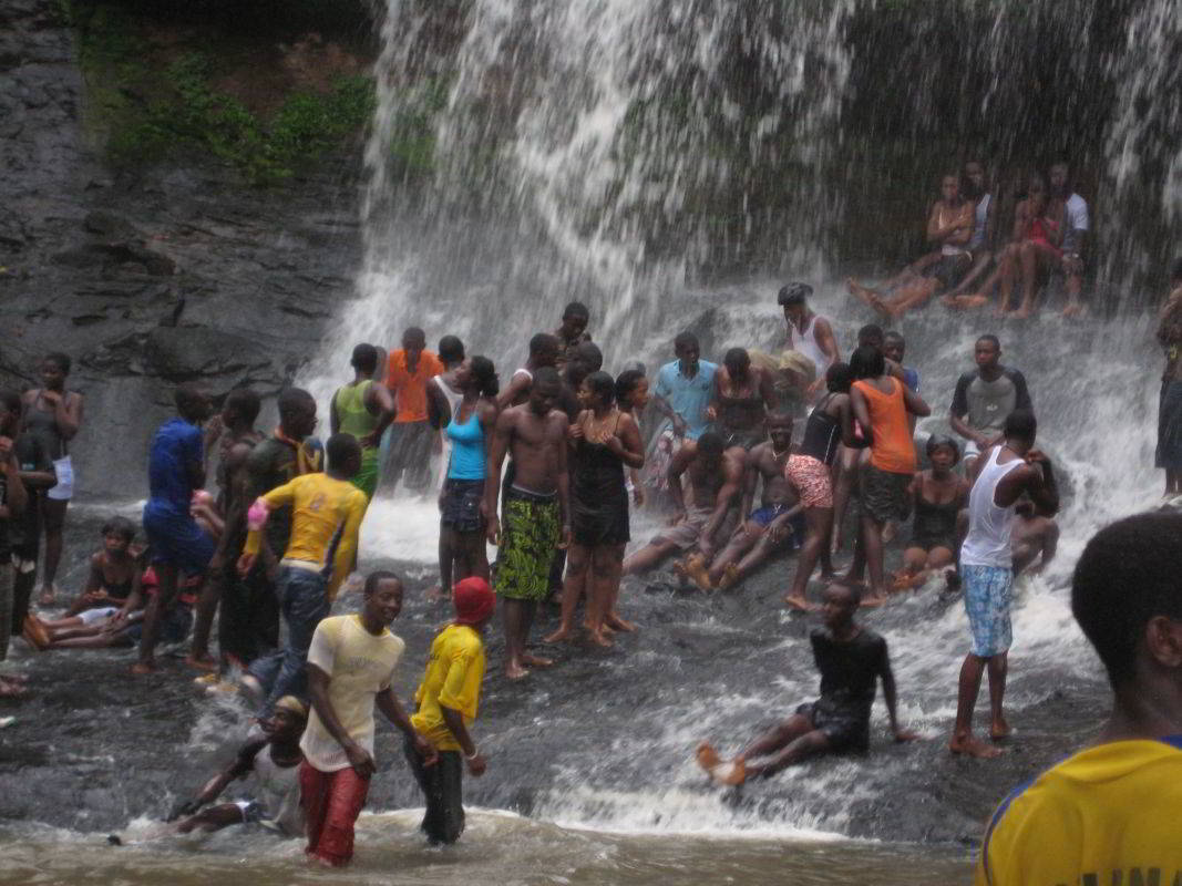 Wir wollen bis nach Kintampo fahren, dort soll es bei den Wasserfällen eine Camp Möglichkeit geben. Immer wieder überquert man in Ghana den "Volta, egal ob im Norden oder Süden. Was wir nicht wissen ist, daß heute Nationalfeiertag ist und alle Jugendlichen aus Kintampo und Umgebung mit Bussen angereist sind um in dem Freizeitpark mit Discomusik zu feiern. An den Wasserfällen geht der punk ab, viele stehen unter dem Wasserfall und es ist eine grosse Party. Allerdings ist um 19.00 Uhr Ruhe, der Park wird abgeschlossen und wir sind alleine mit einem Wächter.