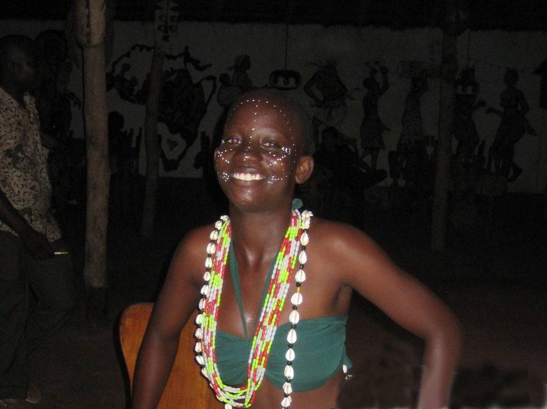 Ein guide (?) überredet uns dann in der Nacht mit ihm zu einem Voodo-Fest zu gehen. Eingedenk der Worte von H. Chesi, es gibt keine Touri Vorführungen, ein christlicher Pfarrer hält auch einen "richtigen" Gottesdienst ab, auch wenn z.B. ein paar schwarze Touris in der Kirche sind, fahren wir dann zu dritt auf seinem Moped irgendwo hin. Auf dem Platz sind sicherlich 500 Einheimische, wir die einzigen "Weißnasen". Sofort werden uns Sessel hingestellt, wir finanzieren das Fest auch mit, lt. Herrn Chesi ist das so üblich. Eine Tanzgruppe von 20 Männern und ca. 40 Frauen in ortsüblicher Tracht gekleidet, tanzen zu Paaren aber auch gemeinsam zu Trommelmusik.