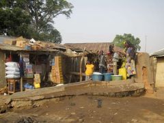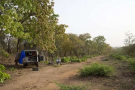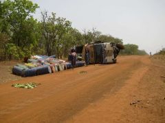 Neue Teerstrasse bis Kosubosu, dann links ab in Richtung Kaiama und Wawa. Nur ein Posten der uns mit „hello“ durchwinkt. Kurz vor Gwasero in den Busch, wir haben für heute von der schlechten aber trockenen Piste ab Kosubosu genug. Viele kleine Fliegen stören bis Sonnenuntergang, aber unter dem Mückenschutz ist es auszuhalten.