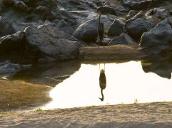 Kampf mit dem Pavian, er will unser Frühstück und springt uns sogar vom Autodach aus an. Ich schätze gute 40kg mit grossen Zähnen, es ist mir nicht wohl dabei. Das Bad im 36°C warmen Quellwasser versöhnt dann wieder.
