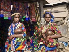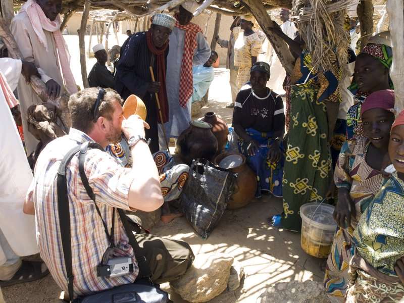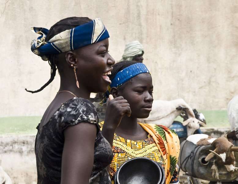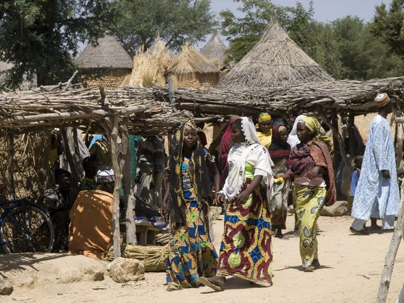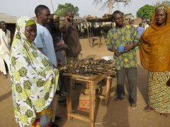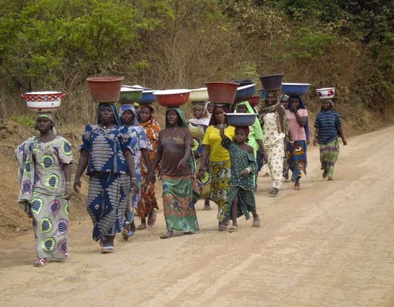 Gwasero Polizeikontrolle – Hello,welcom,ok-. Dann Gesundheitskontrolle d.h. Kontrolle des Impfpasses mitten im Busch, aber mit den bereits vorgefertigten fiches kein Problem. Wen dieser Posten eigentlich kontrollieren soll bleibt uns rätselhaft, so viele Touris kommen sicher nicht vorbei. Die Piste ist sehr schlecht, dort wo sie geteert war nämlich ab Kaima noch übler – Löcher mit Asphalt dazwischen. In den Dörfern haben wir viel Spass mit den Bewohnern, wir werden überall freundlichst begrüsst und sind genauso für sie die Attraktion wie diese es für uns sind. Tolle Pflanzen, evt. Pilze um einen Baum sind einen Fotostopp wert. In Wawa besuchen wir den Markt und erfreuen uns der unwahrscheinlich bunt gekleideten Fulbefrauen und dem insgesamt für uns chaotisch erscheinendem Treiben.