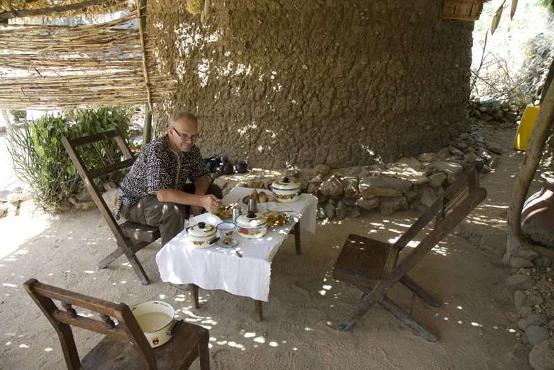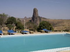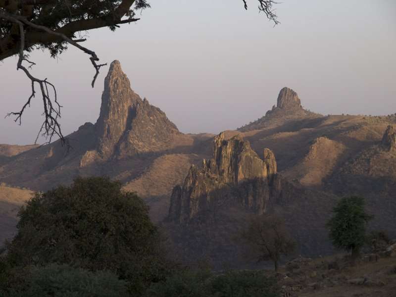6 Uhr aufstehen, 7 Uhr Abmarsch zu den Felsnadeln. Diese sind das erstarrte Basaltmaterial aus den Vulkanschloten, deren äussere Hülle wegerodiert ist, ähnlich wie im Hoggar. Nach anstrengendem Ab und Auf in der Sonne sind wir gegen 10 Uhr wieder im Campement, es war zumindest für mich bei Temperaturen um 35°C im Schatten genug.
