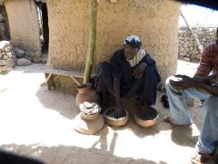 Durch die tolle Landschaft der Mandara Berge Weiterfahrt Richtung Mokolo. Entgegen der Karte im Führer kein direktes Anfahren nach Wanday möglich. Kurz vor Mokolo Abzweig auf gut ausgebaute Piste in das Tal von Wanday und Tourou. Sehr schöne Gehöfte mit Rundhütten und Zipfelmützendächern aus Gras. Besuch eines Marktes auf dem es fast ausschliesslich Hirsebier zu kaufen gab, lt. Olaf leicht säuerlich aber sehr erfrischend. Natürlich waren wir die Attraktion auf dem Markt. Auf der Strasse trafen wir eine Frau mit Kalebasse als Kopfbedeckung wie sie die Frauen aus Tourou tragen. Es gibt hier im Tal fast in jedem Dorf eine andere Ethnie. Hinter Tourou ist der für Autos befahrbare Weg oben auf einem Berg zu Ende. Dieser Abstecher ist sicher einer der Höhepunkte unserer Tour, tolle Gehöfte in phantastischer Landschaft. Absolut sehenswert, sehr gute Piste.
