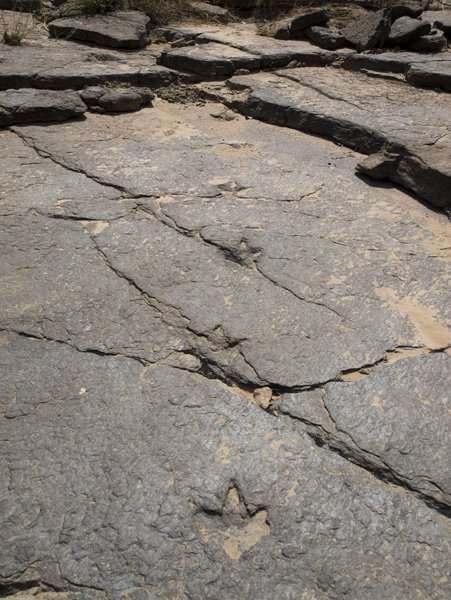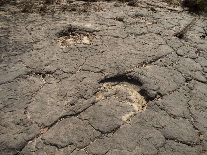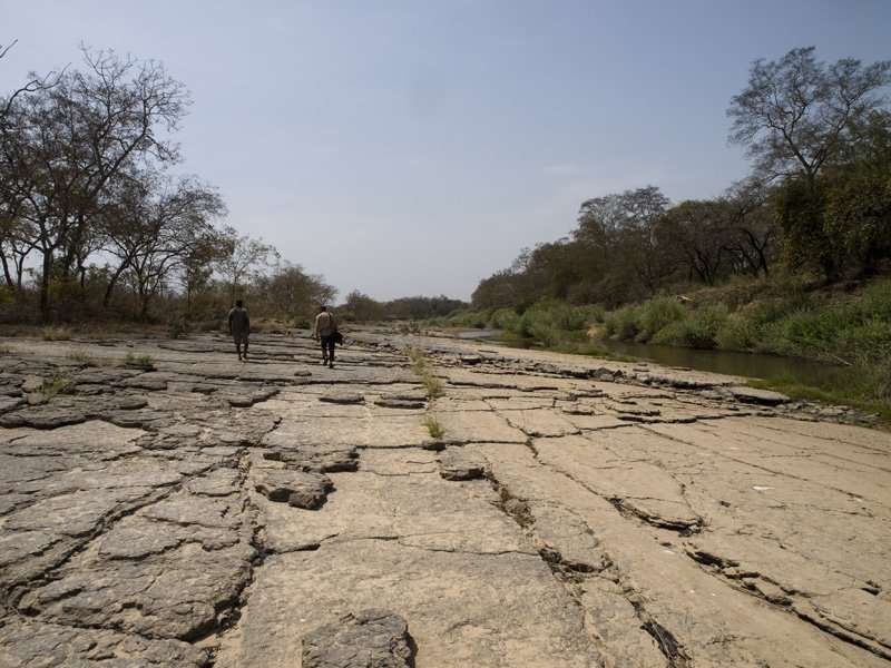 Wir fahren weiter Richtung Osten bis Managna (ca.10km vor Parkeintritt) um ca. 120Mio. Jahre alte Saurierspuren anzusehen. Toll, der eineinhalb Stunden Abstecher hat sich gelohnt. Viele verschiedene Saurier sind hier durch das Flussbett, oder was es damals war, gelaufen und haben Abdrücke hinterlassen, welche jetzt wieder nach einer gewissen Verwitterung der Oberfläche ans Tageslicht kommen.