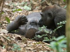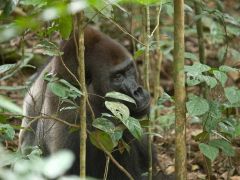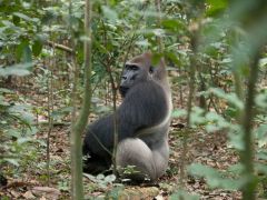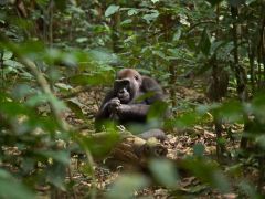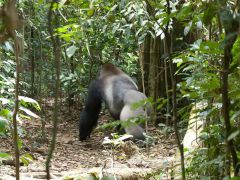 Nach 40 km z.T. übler Piste und gut einer Stunde Fußmarsch durch den Urwald sehen wir Macumba, den Silberrücken dieser Gorillafamilie. Das Gefühl ist nicht zu beschreiben, einem ausgewachsenen Gorillamännchen (180m groß und 180 kg Gewicht) in 5m Abstand gegenüber zu sitzen.
