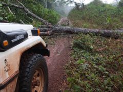 Der Pistenzustand ändert sich öfter von gut nach schlecht und umgekehrt. Nur mit dem Übernachtungsplatz wird es eng, rechts und links dichte Vegetation. Ein Pistenabzweig ist die gute Entscheidung, vor einem umgestürzten Baum bleiben wir einfach auf der Piste auf Schotter stehen. Auch heute Nacht wieder Tropenregen.