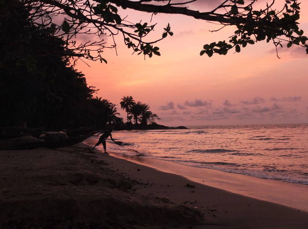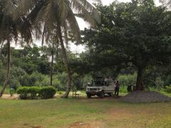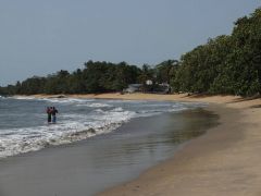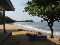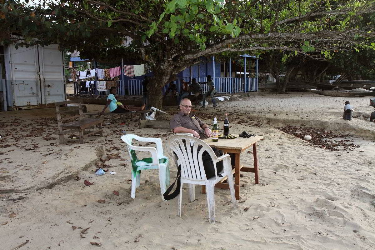 Masken- und Figurenkauf an kleinen Buden mit viel feilschen zu für uns akzeptierte Preise. Weiterfahrt in Richtung "Lobe Wasserfälle" zum "Ilomba beach" ein von Schweizern geführtes Hotel, aber alles voll, da heute Samstag ist. Vermutlich ist aber das kurz davor liegende "Auberge Tara Plage" für Overlander besser geeignet, aber auch hier alles voll, sodaß wir weiterhin im Auto schlafen. Gutes Essen, Wetter schön, Strand kaum Öl, obwohl der Tanker und eine weitere Umladestation direkt vor dem Strand liegt.