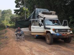 Weiterfahrt in Richtung Sangmélima. Irgendwo fahren wir auf die Piste Richtung Dimpan, nach 5 km fehlt die Brücke. Also ist das ein guter Übernachtungsplatz, wieder mal mitten auf der Piste.