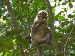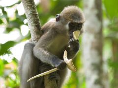 Und weil wir schon hier am Ort sind, streifen wir noch eine Stunde mit einer Gruppe "Agile Mangabeys", kleinen Affen durch den Wald. Auch diese Gruppe ist an den Menschen gewöhnt, sonst würde man die niemals sehen, maximal hören können.