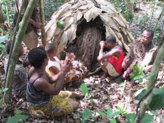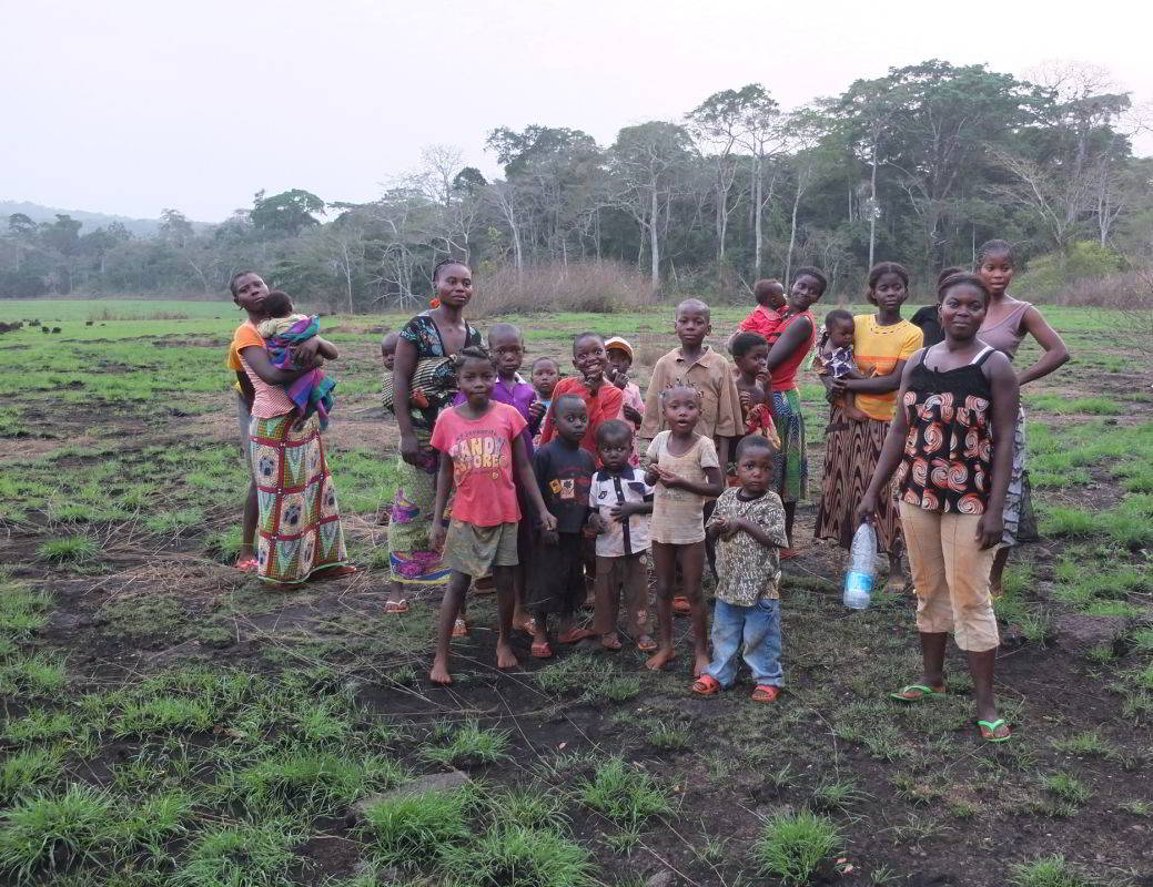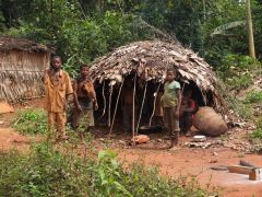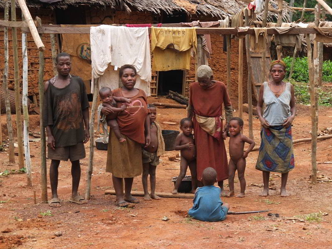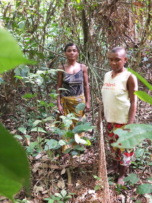 Heiße Sache, es wird immer enger, die Piste ist schon lange nicht mehr von einem PKW befahren worden. (Sie ist aber in Google Earth zu verfolgen). Irgendwo in diesem Nirgendwo treffen wir auf eine Ba Aka Familie, die hier lebt.