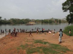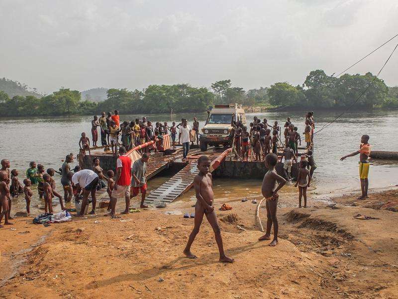 Das Übersetzen mit dem Ponton ist kein Problem und großes Hallo durch die vielen Kinder die hier am Sonntag baden. Dann verstehen wir welches das von dem Fährmann beschriebene Problem ist. Am zweiten Fluss ist kein Ponton. Bei einem Polizist auf der Insel drücken wir nochmals ein paar CFA ab, wir sehen es aber als Vermittlungsgebühr zu Organisation eines Pontons, der hierher kommen soll.