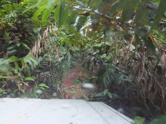 Durch starkes Summen wachen wir auf – das Moskitonetz voller Bienen, die ersten sind schon im Auto. Raus aus dem Auto – in Unterhose und barfuß stehen wir mitten im nassen Urwald, das Auto ist vollständig außen wie innen von Bienen belagert. Feuer und Rauch machen - tolle Idee wenn alles naß ist. Aber wir sammeln trotzdem Holz soweit das in unserem Zustand d.h. barfuß möglich ist. Das Feuerzeug ist natürlich im Auto, genauso wie ein Fläschchen Waschbenzin. Olaf wagt einen Vorstoß ins Auto, bekommt beides zu fassen und erhält dabei nur einem Stich. Mit dem nassen Holz gibt es viel Rauch, Plasikwasserflaschen tun ein Übriges und nach einer Stunde ist der Spuk vorbei.