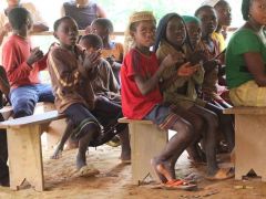 Es stellt sich heraus, es ist möglich. Auf halbwegs vernünftiger Piste fahren wir bis kurz vor die Grenze. Auf einer Lichtung, die aussieht wie eine Wiese mit vielen steinernen Pilzen (Termitenbauten) wird übernachtet, vorher haben wir Besuch der Bevölkerung zweier Dörfer. (Es gäbe hier eine Übernachtungsmöglichkeit in einer katholischen Mission mit Krankenstation.)