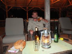Bei 03° 39.000 N und 13° 16.400 O machen wir auf einer Pistenausbuchtung halt. Es ist 15 Uhr und wir haben genug. Jedoch, bis 18 Uhr (Dunkelheit) Myriaden kleiner schwarzer Fliegen, die sich auf alles stürzen was wir angefasst haben, aber vorrangig natürlich auf uns. Es muss unser Schweiß mit entsprechenden Salzen sein. Ich laufe mit langem Hemd und Moskitonetzhut herum, es macht keinen richtigen Spaß. Nachts ein fantastischer Sternenhimmel, den wir mit Lagerfeuer genießen. Gegen Morgen dann doch Gewitter.