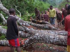 Großer Baumstamm über der Piste, 10 herbeigerufene Pygmäen hauen mit abenteuerlich aussehenden Äxten innerhalb einer Stunde den Weg frei. Es ist 12 Uhr und hat 19°C, ich dachte am Äquator sei es heiß.