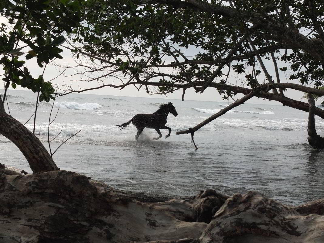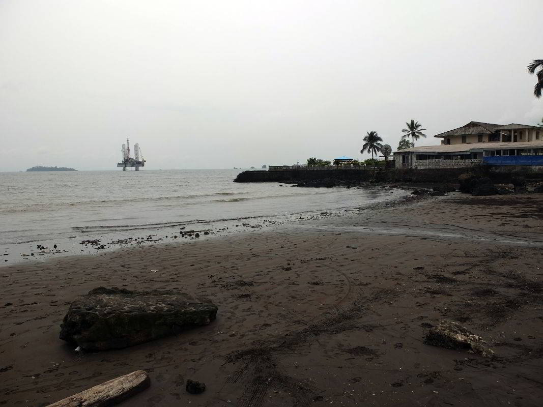 Bei Ebbe ist hier leider in der ganzen Bucht am Strand Öl zu sehen. Vor Kribi liegt ein alter Tanker in den das tschadische Öl aus der Pipeline gepumpt wird und von dort weiter auf die Tanker zum Weitertransport. Bei dieser Verladerei gelangt wohl doch einiges Öl ins Meer und somit an den Strand der nach Süd-West geöffneten Bucht.