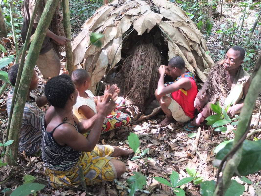 "Net Hunting" mit den BaAka. Das bedeutet, dass wir den Toyo ausräumen, denn 3 Männer, 4 Frauen unsere beiden Führer sowie wir beide müssen untergebracht werden. Mit fröhlichem Gesang geht’s in den Wald. Es ist unglaublich mit welcher Geschwindigkeit die BaAka ihre Netze im völlig unwegsamen Urwald aufbauen. Die sieben Netze werden Halbkreisförmig senkrecht aufgespannt und dann sollen Tiere, vor allem kleine Antilopen durch Lärm aufgeschreckt werden und sich in den Netzen verfangen. Wir haben nichts dagegen, daß das Jagdglück nicht vorhanden ist.
