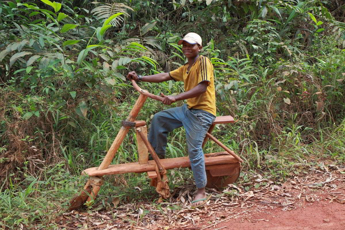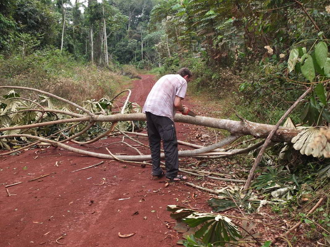 Weiter auf immer besserer werdender Piste – Baum über Piste, Einheimische brauchen mit den Macheten gerade mal 10 Minuten ihn wegzuhacken, dann kommen wir in das Dorf Madoumé, eine große Ansiedlung mit Holzwerk. Viele neu erbauten Holzhäuser haben Fernsehschüsseln. Dann liegt wieder ein Baum über die Piste und wir müssen selbst ran. Nach kurzer Zeit ist das Hindernis beseitigt.
